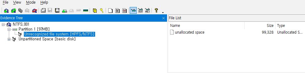 FTK Imager로 확인해봤을 때, 해당 이미지 파일 내 파일시스템이 망가져 내부의 파일들을 확인할 수가 없음